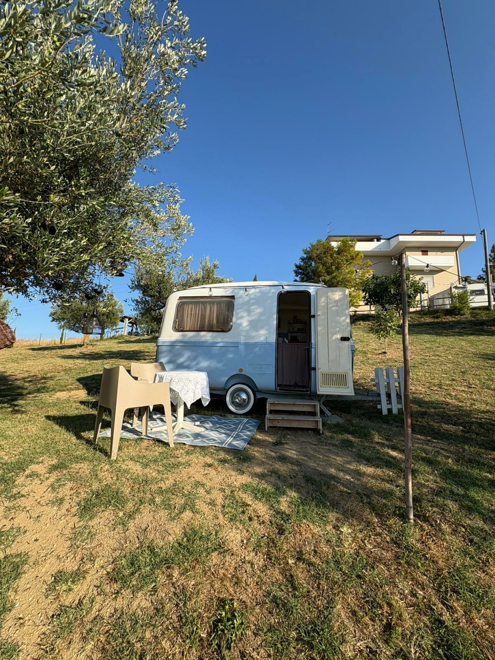 Immersa nel verde, accanto alla nostra tenda Tipì, la roulotte regala una vista incantevole sulla vallata e il silenzio perfetto per staccare davvero la spina.